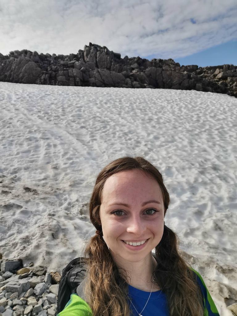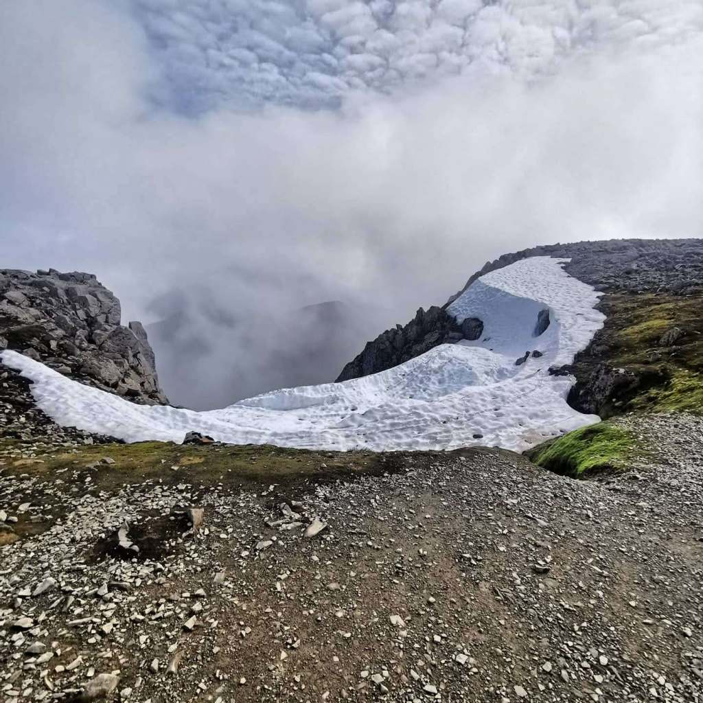 Shortly after my arrival at the summit, thick clouds had rolled in, unfortunately obscuring the view almost completely. Eventually, the chilly breeze kicked in, so I put my zipper back on and decided to begin my descent. I video-called my best friend at the start of my descent to let her know I’d made it (and show her the large patch of icy snow I had to climb down to get back to the path because my inner child was thrilled, obviously).