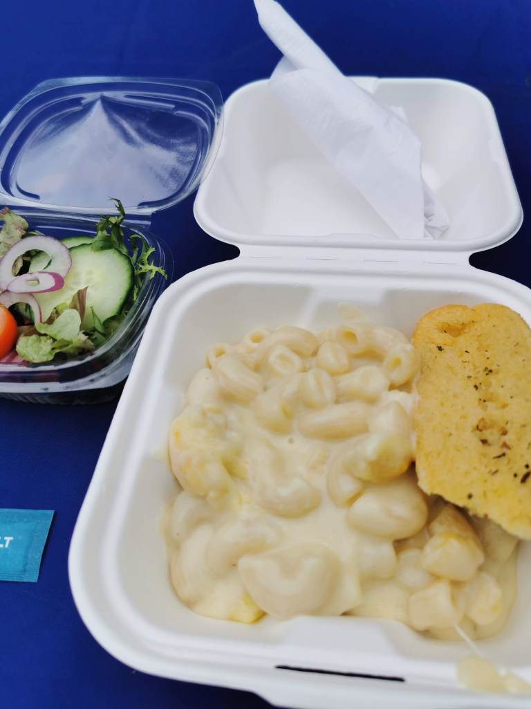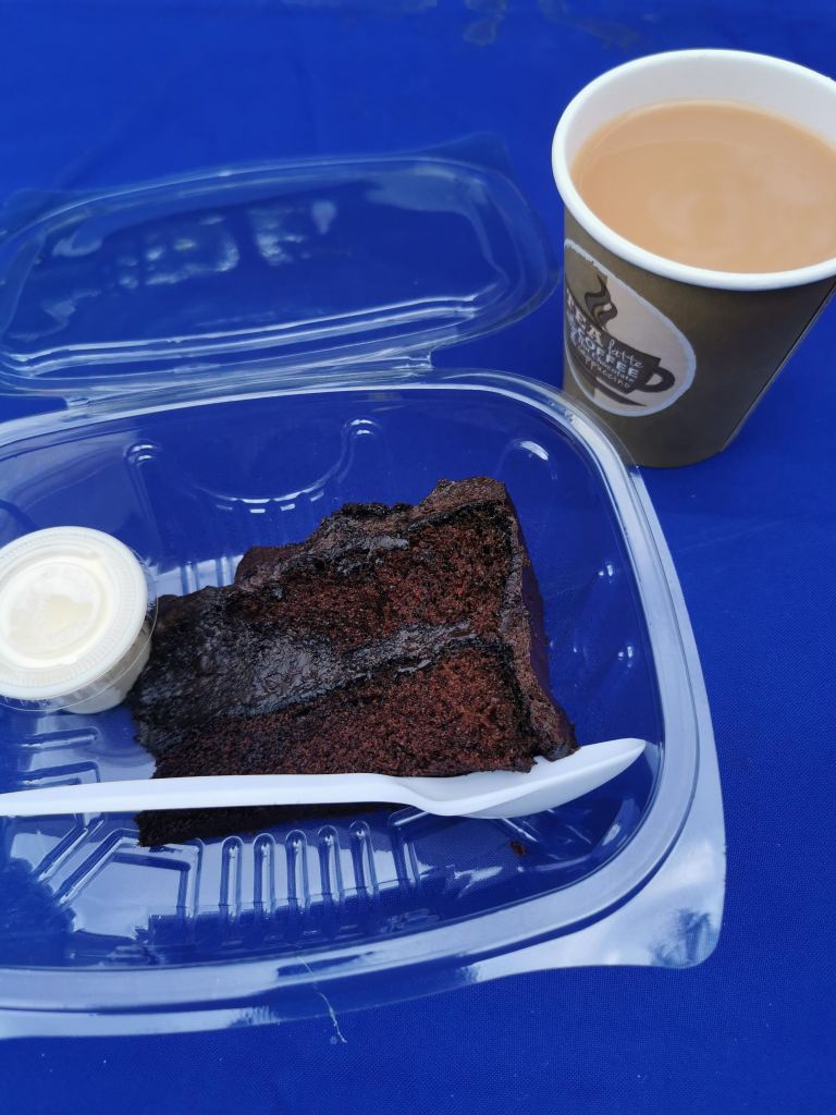 I still met some very interesting people. Unsurprisingly, after my apparently rapid ascent, I was the fifth person to reach the bottom and lingered chatting to the volunteers and the other few who had succeeded before me. Gradually, more and more participants joined us for a delicious feast provided by the Alzheimer’s Society. They served up generous portions of mac’n’cheese, lasagne, and vegetable ragu with the options for garlic bread, salad and tomato soup. Naturally, I devoured a mac’n’cheese with garlic bread, followed by a slab of chocolate cake and cream and eventually followed by a second helping of mac’n’cheese as they had so much leftover food. Unfortunately, around half of the intended participants were unable to join due to complications with covid restrictions and some from having to isolate, hence the immense excess of food (the charity volunteers were joking that no one was allowed to leave until they’d had two helpings – so my two portions of mac’n’cheese was all for the greater good…).