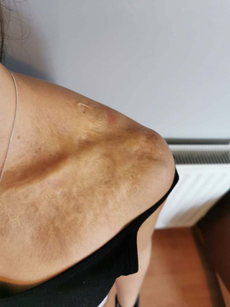 As aforementioned, I have been left with a large scar across my shoulder. However, as you can see from the photos I have included, the raised skin levelled out the redness vastly reduced, although there is a small, tight fissure which is where the haemangioma had ulcerated. We believe the extent of this scarring was potentially worsened by months of the incorrect dressings being applied at the first hospital. The dressings initially being used shouldn’t even have been allowed in the same room as an ulcerated haemangioma never mind plastered on top of one.